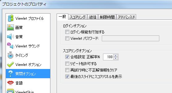スコアリングオプションでは合格設定 正解率%を(100%)に設定しています。