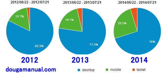 この結果、2014年ではPCの割合は70%ほど、モバイル タブレットの閲覧は実に30%にまで増えています。