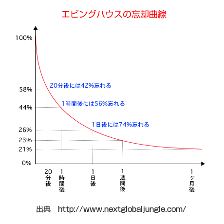 この曲線によると最初の1日から1月後では5%忘れるとなり、