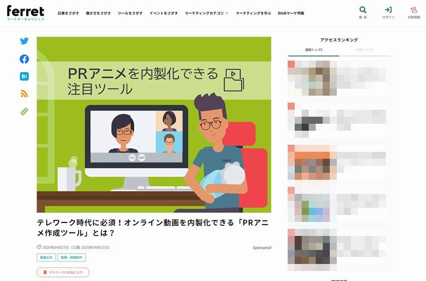 ferretは月刊450万PVを誇るWebマーケティングについて、マーケターの疑問を解決するウェブメディアです。新型コロナウイルスの影響で、テレワークを導入している企業が増えている中、動画を使ったPRの重要性、コンテンツマーケティングのツールとしてVYONDをご紹介していただきました。