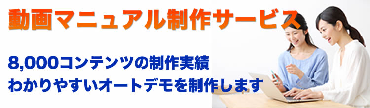 | 追加オプション | ・動画マニュアル作成ソフトウェア¥60,000(税別) ・スタート・エンディングロゴ挿入¥10,000~(税別) ・音声ナレーション追加¥25,000~(税別) ・お客様先でのキャプチャ ¥50,000(税別) ・動画マニュアル追加、再キャプチャ¥50,000~(税別) ・YouTubeチャンネル設定¥50,000(税別) |
