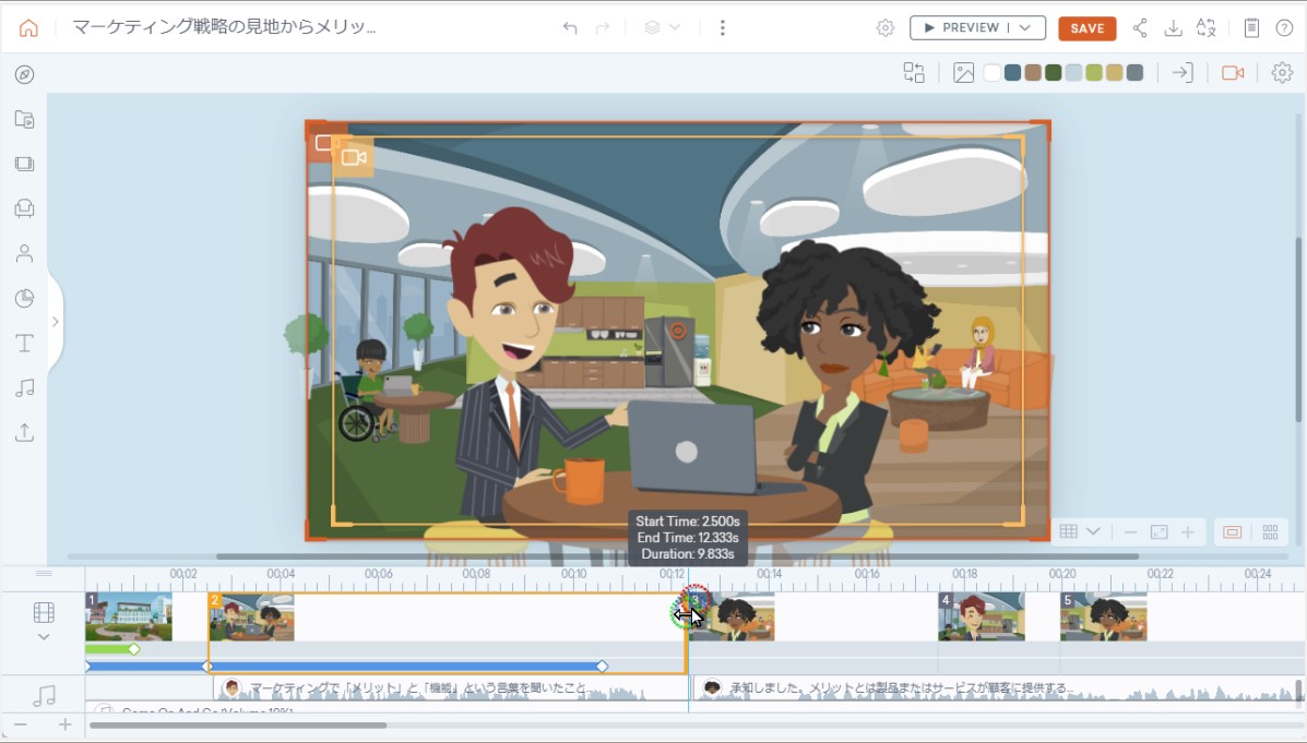 Vyond GOはビジネスアニメーション作成ツールVyondのプラットフォームにシームレスに統合され、VyondプラットフォームのVyond Studioで翻訳、映像編集 微調整を行うことができます。