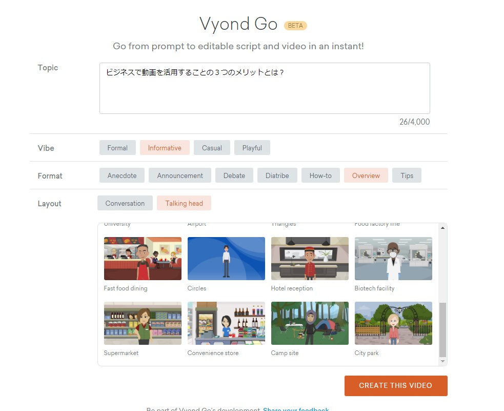 Vyond GOは、さまざまな場所、フォーマット、雰囲気から選択して、プロンプトから動画用にメッセージを表現することができます。白紙のページ」から数秒で関連性の高いラフカット動画に仕上げることができるため、特に高価で時間のかかる従来の動画制作に比べて生産性が高まります。