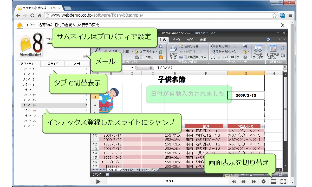 Skinとは再生プレーヤーのこと。今回のバージョンアップでは時間表示機能や、プレゼンテーション用に目次にスライドがつく「Qomplex ViewletSkin」が投入されました。サンプルをご覧ください