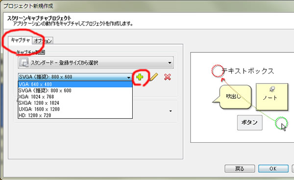ビューレットビルダーでは、キャプチャー時の最初の設定で、キャプチャ範囲(解像度)を指定します。