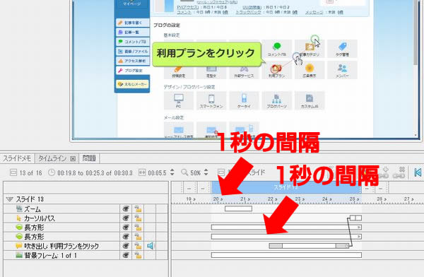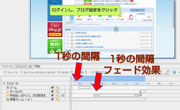 図のタイムラインをみると、2.3の原因、いきなりズームする、吹き出しがズーム中に表示される、ということがわかります。