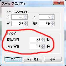 ズームのプロパティから表示時間を1秒 もしくは「0.5秒」に設定します。